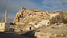 Çavuşin is a village in the Avanos District in Nevşehir Province in the Cappadocia region of Turkey.[1] Its population is 421 (2022).[2] It is on the road between Avanos and Göreme, about five kilometres north of Göreme. The older part of the village lies on and around a large ridge of tock visible for miles around. Most of the modern homes are closer to the main road where villagers were rehoused in the early 1960s amid fears that their old homes might collapse.[3] Until recently Çavuşin was more or less ignored by tourism despite its proximity to the Göreme honeypot. However, in the 2010s more hotels opened in Cavuşin too, especially in the older part of the village.