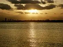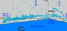 The Ébrié Lagoon is a long narrow lagoon complex located in the south of Ivory Coast. It lies parallel with the coast on an east/west axis and consists of several linked lagoons. At the eastern end it is linked by a channel to the Aghien and Potou Lagoons, into which the Mé River flows. The other major rivers flowing into the lagoon are the Komoé River in the east, the Agnéby River in the centre, and the Ira River in the west. At the western end, Ébrié is linked by the Asagni Canal to the Tagba Lagoon and the Bandama River. It is connected to the Gulf of Guinea by the Vridi Canal, which was opened as a navigable channel in 1950. The natural mouth of the complex is at Grand-Bassam, but this tends to silt up during the dry season. There are several large and many small islands in the lagoon.[1] The cities of Abidjan, Bingerville, Jacqueville, Attécoubé, Tiagba and Dabou lie beside the lagoon and it is crossed by four bridges.[2]