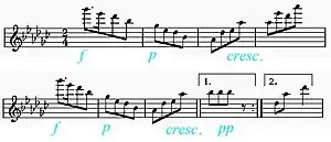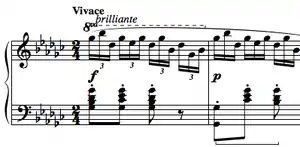 D♭ major is also the key of the middle section which is exactly twice as long as the A section. Its 32 bars though do not subdivide into four eight-bar periods but into sections of (4 + 2) + 4 + 2 + 4 + 8 + 8 bars with six motivically distinct modifications of the original semiquaver triplet figure, thus offering an attractive break from the symmetry.[7]: 106 An effective dynamic increase begins in bar 23 but does not end in a climax as the crescendo does not lead to fortissimo but eases off in diminuendos (bars 36 and 40).[7]: 107 Harmonically the section (bars 23–41) may be interpreted as an extended and ornamented D-flat major cadence.[7]: 107 Musicologist Hugo Leichtentritt (1874–1951) compares the left hand of bars 33–48 to horn signals.[7]: 108 These "announce" the recapitulation of the A part which begins as a literal restatement in bar 49, seems to approach a climax and eases off with a sudden delicatissimo pianissimo smorzando passage, leading via a cadence to the coda. The coda consists of two periods, the last one stretched by three bars.[7]: 109 The first one is a restatement of the middle section's opening transposed to the tonic G♭ major. The consequent of the second period contains a brilliantly swooshing, widely positioned arpeggio for both hands (bars 79(83) and is pianistically attractive. Its effect is based on the accent enforced by a third at the beginning of each triplet, as well as on the tenth and eleventh stretches of the left hand and the ascending bass line covering the entire range of the keyboard.[7]: 109 The piece ends with a rapid octave passage, ff and staccato, played by both hands on black keys, in a G♭ major pentatonic scale. Some prominent performers, including Horowitz and Rosenthal, choose to perform the final octave passage glissando.[8]