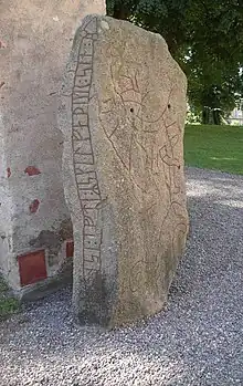 The runestone known as Östergötland Rune Inscription 179 or Ög 179, as listed in the Rundata catalog, stands on the east side of the Vadstena Abbey in Vadstena, Sweden. The stone is tinted red and is about 193 cm in height. The inscription is classified as being carved in runestone style Fp. This is the classification for runic bands that have attached serpent or beast heads depicted as seen from above.