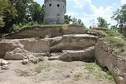 ![]() Ruins of medieval Čeklís Castle. Early 20th century water tower in the background | |