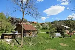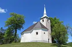 The local church is a chapel of ease dedicated to Saint James and belongs to the Parish of Sveti Vid.[6] The church has a gilded altar from the second half of the 17th century with some late Baroque additions. The altar was renovated in 1928 by the wood-carver Franc Bečaj from Cerknica. The bell tower is several centuries old and appears to have been built as a separate structure. It contains a copper bell dating to 1445. Oral tradition relates that the villagers received the bell from Trsat in exchange for rights to a fair that was held below Kapelšče Hill (770 m) north of the village.[7]