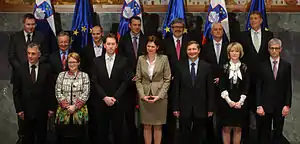 Composition of the new government was quick as it needed to be, as Slovenia was in difficult economic and financial situation that was marked by mass 2012–13 Slovenian protests. Bratušek had most difficulties with finding the new financial minister as nobody was prepared to take responsibility for potential bankruptcy. More than twenty potential candidates have been named until Uroš Čufer finally accepted the position of the new minister.[3] He was confirmed as a minister, even though his candidature was believed to be suspicious as he used to be employed in the biggest national bank NLB, which was in big financial debts. The cabinet of Prime minister Bratušek stabilized the political and economical climate in Slovenia. Her mandate was full of interpellations and increasing number of unemployment and long saga regarding the Ministry of Health and its ministers.[4]