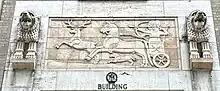 The extreme ends of the base, flanking Beit Simchat Torah's space, contain entrances recessed within travertine marble doorways. The western (right) entrance is used by tenants and their guests, while the eastern (left) entrance is a loading dock.[10] Both entrances are surmounted by tan and brown terracotta panels, which are mirror images of each other. Each panel depicts two hunters in a horse-drawn chariot (one of whom is pointing a bow and arrow at an antelope) as well as a smaller animal under the horse.[15][9] The two-toned panels helped passersby and visitors to identify the entrances easily.[9] Sculptures of lions protrude from the building on either side of each panel.[15][9] Above each entrance, placed within the lintel of the doorway, is a bronze insignia. It consists of the acronym "SJM" surrounded by a wreath, under which is the word "Building".[16]