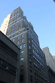 Atlantic Terra Cotta made the architectural terracotta on the building.[4] The building's design includes elements inspired by Middle Eastern architecture, such as ziggurats.[10][11] There are setbacks above the 10th, 14th, and 17th stories, each of which are highlighted with two-colored terracotta friezes.[10] These setbacks were required by the 1916 Zoning Resolution.[11] The architectural historian Christopher Gray wrote of the building in 2004: "The ornamental program of Assyrian reliefs in polychrome terra cotta makes it one of the brightest spots in the area."[7]