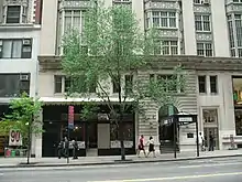 The base is composed of the first and second stories. At the base, the central bay contains a slightly projecting entrance pavilion clad with rusticated and vermiculated limestone blocks.[13] Within this entrance pavilion is an arch with voussoirs flanking a volute above the top of the arch, and a double door approached from a small stoop.[14] A metal and glass canopy, installed in 2000, extends from the entrance into the sidewalk.[15] The remainder of the base contains storefronts or store entrances on the first story. The westernmost wide bay contains a double-height display window, while the other second-story bays contain either pairs of sash windows or multi-pane rectangular windows. Atop the second story is a projecting terracotta cornice, which contains a frieze with alternating circles and triglyphs, as well as a pattern of mutules alternating with rosettes or lozenges on the underside of the cornice.[16]