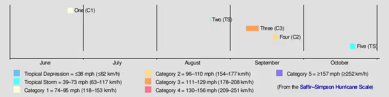 The 1854 Atlantic hurricane season featured five known tropical cyclones, three of which made landfall in the United States. At one time, another was believed to have existed near Galveston, Texas in September,[1] but HURDAT – the official Atlantic hurricane database – now excludes this system.[2] The first system, Hurricane One, was initially observed on June 25. The final storm, Hurricane Five, was last observed on October 22. These dates fall within the period with the most tropical cyclone activity in the Atlantic. No tropical cyclones during this season existed simultaneously. One tropical cyclone has a single known point in its track due to a sparsity of data.