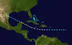 The final tropical cyclone was first observed at 0000 UTC on September 24, while located about 420 miles (680 km) east of Guadeloupe. Initially a tropical storm, it strengthened slightly before crossing the Leeward Islands on September 25.[5] In Guadeloupe, several ships at the port in Basseterre were swept out to sea.[3] Continuing eastward, the storm soon entered the Caribbean Sea. Early on September 26, the system strengthened into a hurricane.[5] By September 28, it was west of the Cayman Islands and had reached Category 2 strength. The storm weakened to a tropical storm after passing Cancún early on September 29 and impacted the Gulf coastline, near the United States–Mexico border, at that strength the next day before dissipating.[5] At Port Isabel, Texas, several hundred homes were swept away, and several towns near the mouth of the Rio Grande also sustained damage.[11]