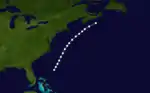 The first known storm of the season was initially observed by the schooner J. W. Coffin on August 16,[4] with the hurricane situated about 255 mi (410 km) northeast of Little Abaco Island in the Bahamas. Due to sparsity of data, HURDAT indicates that the cyclone maintained intensity as an 80 mph (130 km/h) Category 1 hurricane on the modern day Saffir–Simpson scale, as it tracked north-northeastward to northeastward.[5] The hurricane was last noted offshore Nova Scotia by the bark Electra late on August 19.[4]
