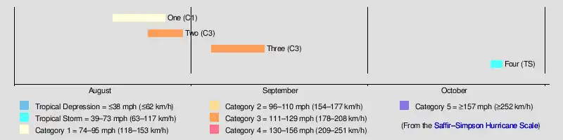 A hurricane was first seen on August 24 to the northeast of the Lesser Antilles. Resembling a Cape Verde-type hurricane, it moved to the northwest, and reached major hurricane status on the 28th. On the 29th, the hurricane peaked at 130 mph (210 km/h), but turned to the northeast where unfavorable conditions caused it to weaken. It passed south of the Canadian Maritimes, and became extratropical on August 30 to the east of Newfoundland. The extratropical storm persisted until September 2 when it lost its identity over East Anglia.