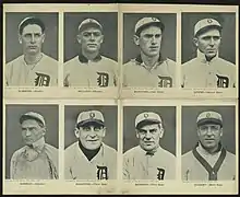 Some members of the team, shown on baseball cards. Sheet of eight postcards featuring Detroit baseball players: Summers (Pitcher); Willett (Pitcher). McIntyre (Left Field); Downs (Second Base); Schmidt (Catcher); Schaefer (Third Base); Rossman (First Base) and O'Leary (Short Stop).