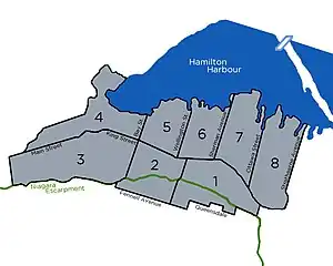 ![]() Each of Hamilton's eight wards. Electors would send two Alderman per ward to City Hall in addition to four Controllers and one Mayor elected at-large. | ||||||||||||||||