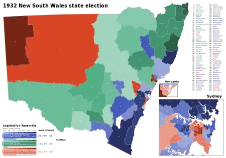 The 1932 New South Wales state election was held on 11 June 1932. This election was for all of the 90 seats in the 30th New South Wales Legislative Assembly and it was conducted in single member constituencies with compulsory preferential voting. It was a landslide victory for the UAP/Country Party coalition of Bertram Stevens, which had a majority of 42 in the Assembly.[1][2][3]