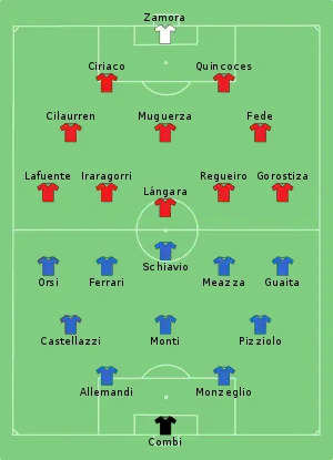 A torrential downpour hampered the Austrians' passing game while benefiting the more varied Italian game. Italy took the lead when a ball broke free from the Austrian goalkeeper because of an intervention by Giuseppe Meazza. The ball then hit the post and was turned into goal by a perfectly positioned Enrique Guaita. In the second half, Austrian efforts to equalize were stopped by Gianpiero Combi, and Italy managed to hold on for the victory.[2]