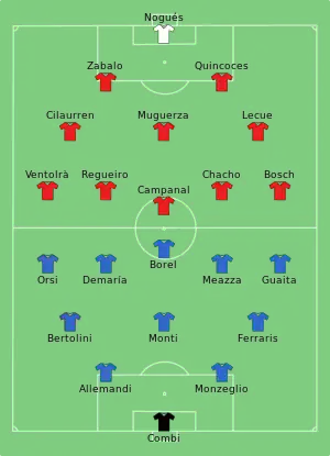 The replay was played the day after the first game. The exhaustion and the injuries resulting from the first tie forced Italy and Spain to make four and seven changes respectively. Most notably, the experienced Zamora had to give way to the uncapped goalkeeper Juan José Nogués. Once again, the game was marred by controversial refereeing decisions. In the first five minutes, Crisant Bosch was hacked down by Eraldo Monzeglio in the penalty box. The penalty was not given, but the tackle resulted in the injury of Bosch. With no substitutes available, Spain had to play the remainder of the game with 10 men. Giuseppe Meazza scored soon after from a corner kick situation. In the second half, two Spanish goals were disallowed: one for offside and the other for a foul on a Spanish player. The referee, René Mercet, was suspended in the aftermath of the tournament.[2]