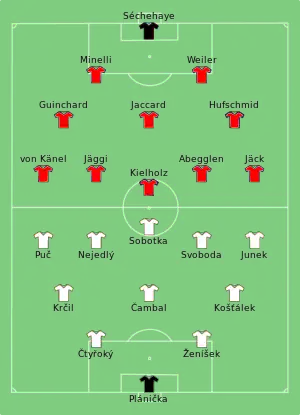 In a well-balanced game, Switzerland took the lead with Kielholz thanks to a counter-attacking play. Czechoslovakia equalized soon after with František Svoboda, who turned a chance created by Jiří Sobotka into a goal. In the second half, although Switzerland dominated the ball possession, it was Czechoslovakia scoring twice and holding on for the victory.[2]