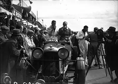The race was winding down to a predictable finish, when Fontés pitted at 3pm, off-schedule. At the previous pit-stop, the car had not had its oil topped up. The Lagonda had a two-lap lead but had dangerously low oil pressure. Rules stipulated it was not allowed to be replenished outside the standard pit-windows, so with less than an hour to go, he gingerly left for another lap.[31][27][4] He came back with the car running worse, but the pit-crew exhorted him to carry on, albeit cautiously. Louis-Dreyfus was driving hard, and with 20 minutes to go, the public-address loudspeaker reported he was closing in quickly on the Lagonda for the lead. The next lap he overtook Fontés and his pit-team signalled him to ease off, believing him to now be leading. However, at 3.55, the announcer admitted the mistake that the Alfa was, in fact, still 3 minutes behind on the same lap.[8][31][4][29] By then it was too late to catch the ailing Lagonda and it came home for the first British win since Bentley at the start of the decade.[33]
