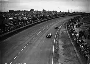 Bugatti's largest entry yet at Le Mans saw eight cars arrive. The two biggest were ex-works Type 50 Sports, with their mighty 5-litre supercharged engines. Racing journalist Roger Labric once again had works support, and their driver Pierre Veyron. The other was owned by the wealthy French aristocrat Charles Richer-Delavau.[10] French film director Georges d'Arnoux had raced earlier in the decade but his was his first Le Mans. He shared a 2.3-litre Type 55 with fellow-nobleman Pierre Merlin. There were two touring models – a Type 44 and an elegant new Type 57. This had the supercharged straight-8 engine from the Type 59 Grand Prix car bored out to 3.3-litres giving 135 bhp. It was owned and entered by Franco-Brazilian Pedro Bernardo de Souza Dantas.[11] Three French Bugatti drivers, Max Fourny, Albert Blondeau and Bernard Chaudé had formed a new racing team. The Écurie Argo had two entries: a 2.3-litre Type 51 modified with aerodynamic bodywork over the rear suspension would be driven by Fourny and Chaudé. The other was a Type 35 chassis fitted with a supercharged 2-litre engine with similar bodywork applied. Blondeau had Paul Vallée as his co-driver.[12] The final Bugatti was a Type 51A driven by champion boxer Louis Villeneuve. However, the 1.4 modifier put the supercharged 1.5-litre engine up against 3-litre cars.[11]