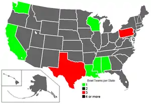 Number of bowl games per state. Note that the Bacardi Bowl was held in Havana, Cuba.