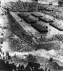 ![]() The West Point Corps of Cadets on the field at the Army–Notre Dame football game on November 9, 1946 at Yankee Stadium. | |||||||||||||||||||