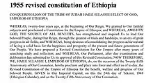 The 1955 constitution was Ethiopia's second written one, the first being the 1931 constitution.[1] It was prompted, like its predecessor, by a concern with international opinion. Such opinion was particularly important at a time when some neighboring African states were rapidly advancing under European colonial influence and Ethiopia was pressing its claims internationally for the incorporation of Eritrea, where an elected parliament and more modern administration had existed since 1952.[2]