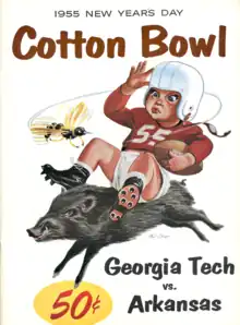The 1955 Cotton Bowl Classic was a post-season college football bowl game between the Southwest Conference champion Arkansas Razorbacks and the champions of the SEC, the Georgia Tech Yellow Jackets. Georgia Tech defeated Arkansas, 14–6, in front of 75,550 spectators.[1] Arkansas would get their revenge in the 1960 Gator Bowl, a 14–7 Hog win.[1]