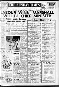 The Sunday Times the day after the election, reporting on the results and David Marshall's Labour Front victory.