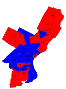 1961 Philadelphia District Attorney's race by ward, with Crumlish in blue and Smith in red