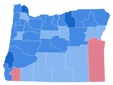 Oregon was won by incumbent President Lyndon B. Johnson (D–Texas), with 63.72% of the popular vote, against Senator Barry Goldwater (R–Arizona), with 35.96% of the popular vote.[3][4] As of the 2020 presidential election, this is the last election in which the following counties voted for a Democratic presidential candidate: Douglas, Klamath, Lake, Harney, Wallowa, Union, Baker, Umatilla, Grant, Sherman, Polk and Yamhill.[5] Furthermore, Oregon would not vote for a Democratic presidential candidate again until 1988. This marks the last time that a Democratic presidential nominee has carried a majority of Oregon's counties.