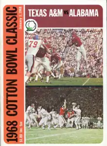 The 1968 Cotton Bowl Classic, part of the 1967 bowl game season, was the 32nd edition of the college football bowl game, held at the Cotton Bowl in Dallas, Texas, on Monday, January 1. It matched the eighth-ranked Alabama Crimson Tide of the Southeastern Conference (SEC) and the unranked Texas A&M Aggies, champions of the Southwest Conference (SWC). Underdog Texas A&M won the game 20–16.[2][3]