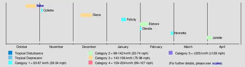 | Diana | December 8 – 18 | Category 3 severe tropical cyclone | 130 km/h (80 mph) | 965 hPa (28.50 inHg) | ||||