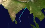 The monsoon trough spawned a tropical depression on November 14. It tracked westward, becoming a tropical storm on the November 15 and a cyclone on November 16. A break in the subtropical ridge pulled the cyclone northward, where it slowly strengthened to a peak of 125 mph winds. It hit the Andhra Pradesh coastline on November 19 at that intensity, and dissipated the next day. Strong winds, heavy flooding, and storm surge of 5 meters high killed 10,000 people,[9] left hundreds of thousands homeless, killed 40,000 cattle.[10] and destroyed 40% of India's food grains.