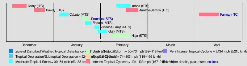 During the season, the Réunion Meteorological Service tracked storms in the basin, using the Dvorak technique to estimate tropical cyclone intensities via satellite imagery.[1] The agency later became Météo-France's meteorological office at Réunion (MFR). At the time, the basin extended from the east coast of Africa to 80° E.[2] Eleven storms were named by the Mauritius Meteorological Service and the Madagascar Meteorological Service.[1] The rest of the naming list was Lalao, Monja, Nora, Olidera, Pelazy, Rija, Saholy, Tsira, Vaosolo, Wilfredy, Yannika, and Zozo.[3] The 11 named storms were slightly above the normal of 9, most of which formed in January and February. There were four intense tropical cyclones, which is twice the average. The increased activity of the season was in part due to enhanced easterlies, a strong monsoon trough, and warm water temperatures around 28 °C (82 °F) which extended to 25° S.[4]
