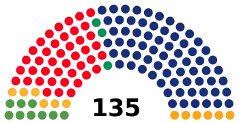 Last election 72 seats, 46.8% 41 seats, 30.1% 6 seats, 9.2%[lower-alpha 1]