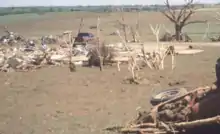 Damage in Bridge Creek was extreme, as many homes were swept away completely, leaving only concrete slabs where the structures once stood. Damage surveyors noted that the remaining structural debris from some of the homes in this area was finely granulated into small fragments, and that trees and shrubs were completely debarked.[22] A few of these homes were bolted to their foundations. Approximately 200 houses and mobile homes were destroyed, and hundreds of other structures were damaged. The Ridgecrest Baptist Church in Bridge Creek was also destroyed in the process. Extensive ground scouring occurred, and vehicles were thrown hundreds of yards from where they originated, including a mangled pickup truck that was found wrapped around a telephone pole. About one inch (25 mm) of asphalt was scoured off one road.
