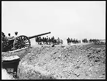 The 1/1st Battery received its embarkation orders on 12 April 1915 and entrained for its port of embarkation on 19 April. It disembarked at Le Havre on 21 April. The Northumbrian Division completed its concentration in the area of Steenvoorde on 23 April and went into action the next day at the Battle of St Julien.[22][30] The 1/1st Bty was transferred away from the Northumbrian Division on 6 May to join the XIII Brigade, RGA, and moved to positions in the angle of the BrielenVlamertingeElverdinge roads, west of the Yser Canal. It took part in the subsequent Battle of Frezenberg, engaging targets north of St Julien on 8 May, when its old 4.7-inch guns 'did fair shooting'. It remained in these positions, supporting troops in the Ypres Salient during May and June 1915.[22][23][31]