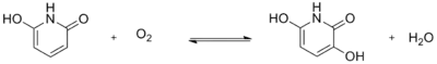 Another reaction of 2,6-dihydroxypyridine highlights its function as a substrate for oxygenase. One example is the enzyme monooxygenase, which oxidizes the substrate by transferring one oxygen atom of O2 to the substrate. The other oxygen atom is reduced to water. The product of the oxidase reaction was determined to be 2,3,6-tri-hydroxypyridine because of the results of the stoichiometry as well as the results of the ultraviolet spectrum. This reaction can be shown by the following equation:
