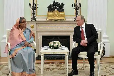 The Awami league won national election on 29 December 2008 as part of a larger electoral alliance that also included the Jatiya Party led by former military ruler General Hussain Muhammad Ershad as well as some leftist parties. According to the Official Results,[14] Bangladesh Awami League won 230 out of 299 constituencies, and together with its allies, had a total of 262 parliamentary seats.[15] The Awami League and its allies received 57% of the total votes cast. The AL alone got 48%, compared to 36% of the other major alliance led by the BNP which by itself got 33% of the votes. Sheikh Hasina, as party head, is the new Prime Minister. Her term of office began on 7 January 2009 after Fakhruddin Ahmed.[16][17] The new cabinet had several new faces, including three women in prominent positions: Dr Dipu Moni (Foreign Minister), Matia Chowdhury (Agriculture Minister) and Sahara Khatun (Home Minister). Younger MPs with a link to assassinated members of the 1972–1975 AL government are Syed Ashraful Islam, son of Syed Nazrul Islam, Sheikh Fazle Noor Taposh, son of Sheikh Fazlul Huq Moni, and Tanjim Ahmad Sohel Taj, son of Tajuddin Ahmad.