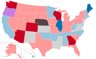 Regularly-scheduled elections were held in 91 of the 99 state legislative chambers in the United States. Nationwide, regularly-scheduled elections were held for 6,381 of the 7,383 legislative seats. Many legislative chambers held elections for all seats, but some legislative chambers that use staggered elections held elections for only a portion of the total seats in the chamber.[4] The chambers not up for election either hold regularly-scheduled elections in odd-numbered years, or have four-year terms and hold all regularly-scheduled elections in presidential midterm election years.