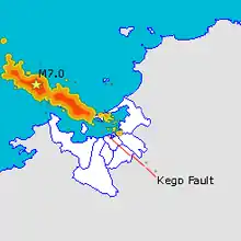 The Fukuoka earthquake (福岡県西方沖地震, Fukuoka-ken Seihō Oki Jishin) struck Fukuoka Prefecture, Japan at 10:53 am JST on March 20, 2005, and lasted for approximately 1 minute. The Japan Meteorological Agency (JMA) measured it as peaking at a magnitude of 7.0, whereas the United States Geological Survey (USGS) reported a magnitude of 6.6.[1] The quake occurred along a previously unknown fault in the Genkai Sea, North of Fukuoka city, and the residents of Genkai Island were forced to evacuate as houses collapsed and landslides occurred in places. Investigations subsequent to the earthquake determined that the new fault was most likely an extension of the known Kego fault that runs through the centre of the city.