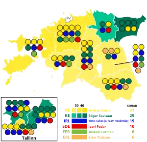 After the 2003 election, the Centre and Res Publica parties nearly tied for first place, with both saying that they should get the chance to try and form the next government,[3] while ruling out any deal between themselves.[4] President Rüütel had to decide who he should nominate as Prime Minister and therefore be given the first chance at forming a government.[4] On the 2 April he invited the leader of the Res Publica party, Juhan Parts to form a government[5] and after negotiations a coalition government composed of Res Publica, the Reform Party and the People's Union was formed on the 10 April.[5] The government has also been referred to as the Harmony coalition.[6][7][8][9]