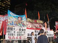 On 7 October 2007, Chan made a brief appearance at a rally to demand full democracy by 2012. She left the rally to visit her hairdresser before an engagement that evening. She was accused of lacking in political sensitivity.[31] Whilst electioneering in November, a political analyst said Chan may have made another serious blunder by agreeing to be a sponsor for Retired Persons' Association.[32]