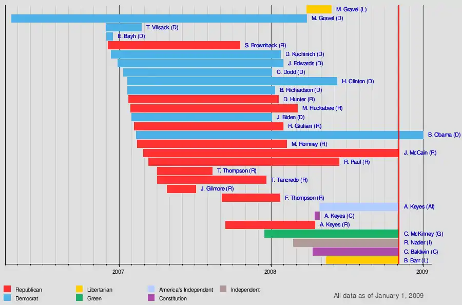 - December 1 – Democratic Senator Evan Bayh of Indiana announces the formation of an exploratory committee.[23] On The Tonight Show, Democratic Senator Barack Obama of Illinois states he is considering running for president.[24]