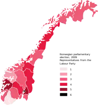 Parliamentary elections were held in Norway on 13 and 14 September 2009.[1] Elections in Norway are held on a Monday in September, usually the second or third Monday, as determined by the king.[2] Early voting was possible between 10 August and 11 September 2009,[3] while some municipalities also held open voting on 13 September.[1] Voters elected 169 members for the Storting,[4] each for a four-year term.[5] Voter turn-out in the 2009 general elections was 76.4%.[6]