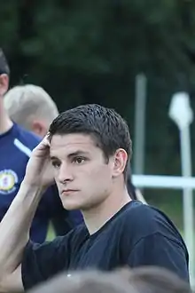 Lambert made his first signing a month into his reign (2 July) at Villa, when he signed Moroccan midfielder Karim El Ahmadi from Feyenoord for an undisclosed fee, reported to be £2 million. El Ahmadi stated before his arrival that joining the club, and playing in the Premier League, would be a "dream come true" and that he was looking forward to "dictating games" for Villa.[26][27] Four days later (6 July), Lambert made his second summer signing when young defender Matthew Lowton joined for an undisclosed fee, reported to be £3 million from Sheffield United[28] Following his move to Villa, Lowton stated that he hoped to emulate former Sheffield United player Phil Jagielka in reaching the England squad.[29] The new manager announced on 16 July that the club would be re-signing Brad Guzan on a three-year deal, after he was previously released in May.[30] Lambert later stated that he had re-signed Guzan so that he could challenge Shay Given for the number one spot, and Guzan backed this up by declaring he had not returned to sit on the bench.[31] 1 August 2012 saw two transfers at the club – one in, one out – as James Collins returned to his former club West Ham United for £2.5 million, to pave the way for Villa to recruit central defender Ron Vlaar from Feyenoord – the second player of the summer to join Villa from the Rotterdam club (after El Ahmadi) and the third from the Eredivisie (after El Ahmadi and Holman). The club again announced the transfer as an undisclosed fee but the media reported the deal to be worth about £3 million. Vlaar immediately declared his ambition to become a Villa great and aimed to become a club legend in central defence, just as Paul McGrath and Martin Laursen had done so previously.[32][33] It was announced that Darren Bent would become Villa's new club captain whilst Stiliyan Petrov was absent, recovering from acute leukaemia.[34]