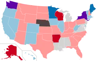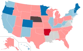 Democrats won the Colorado House of Representatives, Maine Senate, Maine House of Representatives, Minnesota Senate, Minnesota House of Representatives, New Hampshire House of Representatives, and Oregon House of Representatives that was previously tied. Meanwhile, Republicans won the Wisconsin Senate which was briefly under Democratic control after multiple recall elections earlier in the year, and both chambers of the Arkansas legislature for the first time since 1874. The Alaska Senate went from a Democratic-led coalition to Republican control. The Washington Senate went from Democratic control to a Republican-led coalition, and the New York State Senate went from Republican control to a Republican-led coalition.