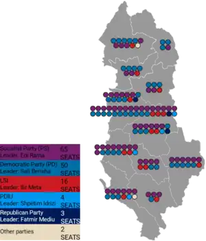 Elbasan 14 75,086 43.26% 6 46,788 29.96% 4 18,484 10.65% 2 12,110 6.98% 1 6,266 3.61% 1 14,842 8.55% 0