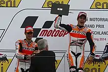 Dani Pedrosa and Marc Márquez, celebrating on the podium after finishing second and first at the MotoGP race.