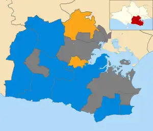 Map of the results of the 2014 Purbeck District Council election. Conservatives in blue and Liberal Democrats in yellow. Wards in grey were not contested.