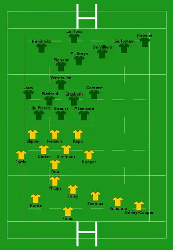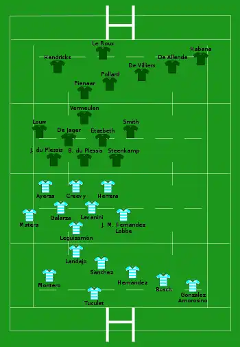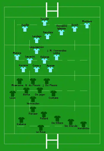 The second match of the tournament was between South Africa (the Springboks) and Argentina (the Pumas) and played at Loftus Versfeld Stadium in Pretoria, South Africa. South Africa won 13–6 and scored the only try of the match, which was played in wet and raining conditions.[11] The following week the two teams met again, this time at Estadio Padre Ernesto Martearena in Salta, Argentina. The Springboks won again, but were considered lucky to get the 31–33 victory. At one stage Argentina were winning by 12 points, and were leading with five minutes remaining, but Springbok Morné Steyn kicked a penalty in the 76th minute to give South Africa the lead and the win.[12]